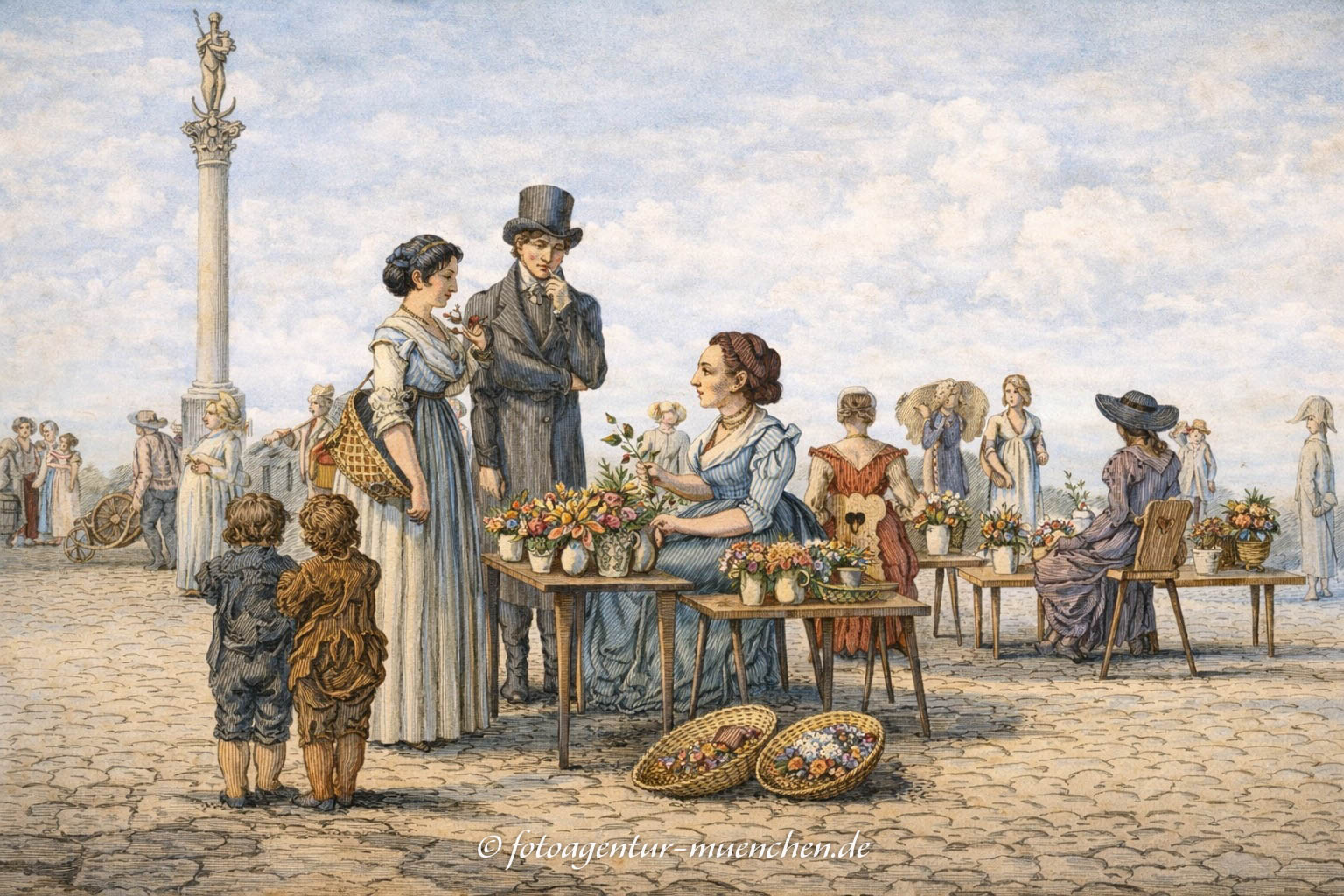 „Die untere Hälfte des Kupferstiches zeigt eine Ansicht gegen den Platz mit einigen Blumenverkäuferinnen, welche sich gerne hier hinzusetzen pflegen, weil man hier vom Platze weg in die Rosengasse hineingeht, mithin die Passage stärker ist. — Der Blumenverkauf dauert von Josephi bis Therese im Oktober, nach den verschiedenen Arten, die Treibhäuser und Zeit hervorbringen.“