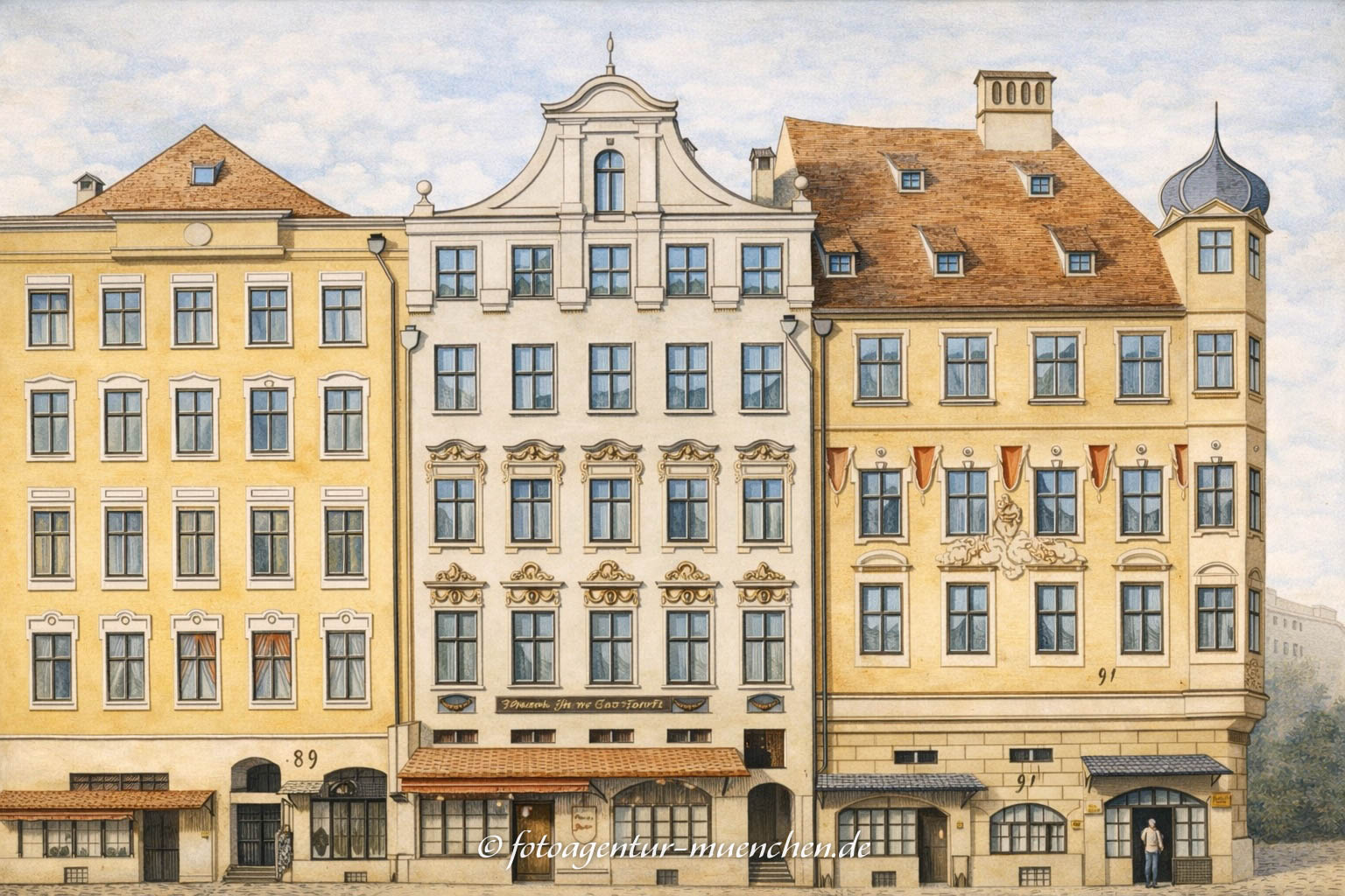 Die Häuser Nr. 89, 90 und 91 am Platz Petri (nun Marienplatz). „a. Das Haus Nr. 89, so wie die folgenden ist über die Bögen gebaut, welche den ganzen Schrannenplatz allhier zur Bequemlichkeit des Publikums umgeben. — Es hat einen Hof, stetten Wasser, Keller, Ausguß und Retiraden“, und gehörte zu Anfang des XVI. Jahrhunderts dem Peter Laimdauer und seiner Schwester Elsbeth. Vom Schlusse desselben Jahrhunderts an war es fast immer im Besitz von Handelsleuten, darunter ein Andrea Groffet aus Megene in Savoyen; weiterhin, 1725, kam es in die Hand des kurfürstlichen Fähnrichs im Regiment Kurprinz, Frz. Pet. Wambersay, darauf an den Gürtler Joh. Nikl. Steinhäuser, 1777 an den Hofklingenschmied Jos. Reger, dann an Gottl. Ferdinand Höger auf Essing und 1786 an den Briechler Dav. Lory. Im Jahre 1805 wohnten in der zweiten Etage des Hauses der Dichter Jos. Babo, Hofkommissär des kurfürstlichen Hof- und Nationaltheaters und die kurfürstliche Hofschauspielerin Mad. Antoine. — Dermal ist das Haus mit Nr. 27 bezeichnet und Eigenthum des Agenten Herrn Aug. Doignon.