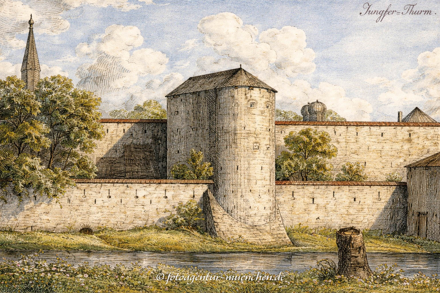 „Gegenwärtiges Kupfer stellt den sogenannten Jungfernthurm vor, welcher als ein Theil der vormaligen Befestigungswerke von München zwischen der Palais-Max-Brücke und dem Theatinergebäude gestanden hatte, und im Jahre 1804 abgebrochen worden ist.“ Er stammte aus der Zeit Ludwigs des Bayern und seines Bruders Rudolf. „Dieser Thurm hatte in der Höhe 70 Schuhe, im Umkreise 120 Schuhe und die Mauern hatten am dicksten Orte 9 Schuhe, am wenigst dicken aber 6 Schuhe. — — Man sieht sehr deutlich, dass das Dach dieses Thurmes ungleich später aufgesetzt worden ist rc. In späteren Zeiten wurde der Thurm benützt, um die Opernkleider darin zu verwahren. Unter dem Volke ging immer das Gerücht herum, dass in diesem Thurme in ältesten Zeiten ein heimliches Gericht gearbeitet habe und vielleicht manche Opfer begraben haben möge.“