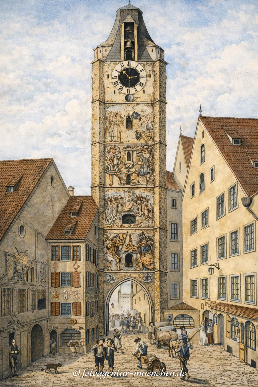 „An der Seite dieses Thurmes, welche gegen die Kaufingergasse sieht, bemerkt man noch, mit welcher imponirenden Schönheit nach damaliger Sitte derselbe übermalt gewesen ist. Die zweite Etage von unten hinauf stellt den Kaiser auf dem Throne sitzend vor. Die Kurfürsten und die Großen des Reiches, ihre Wappen zu den Füßen, stehen dem Kaiser rechts und links zur Seite. Vor dieser majestätischen Versammlung pflügt ein Bauer das Feld. Über dem Kaiser sind die Paniere des Reiches und unter dem Kaiser die Paniere des bayerischen Hauses. In der vierten Etage verkündigen Trompeten und Zymbeln, wie der Bauernstand durch diesen öffentlichen Beweis des seinem Fleiße zugesicherten Schutzes geehrt sei. An dem Rande des Thurmes sind verschiedene Verzierungen, und ganz unten neben dem gothischen Thore Menschen aus verschiedenen Ständen vorgestellt, welche über diese Scene ihren Beifall zu geben scheinen. Es ist dabei eine Umschrift enthalten, wo man das Wort Jahr Christi noch deutlich lesen kann, keineswegs aber die Jahrzahl.