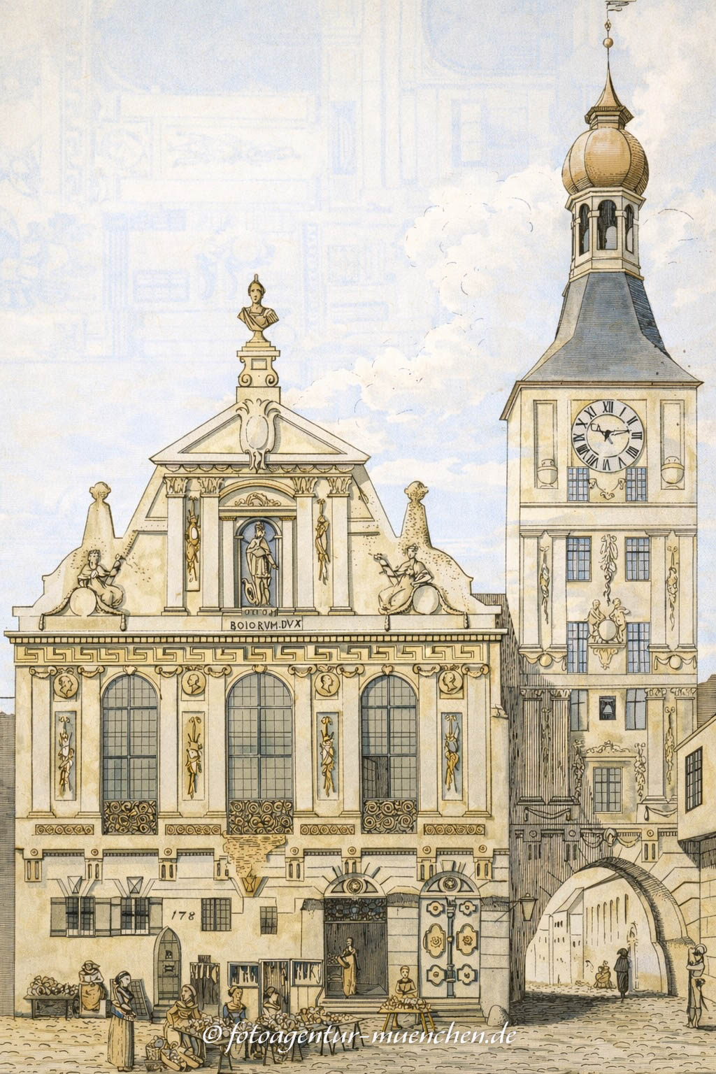 Die dermalen äußere Verzierung hat das Rathhaus im Jahre 1778 unter dem Stadt-Oberrichter von Bergmann erhalten, als Kurfürst Karl Theodor höchstsel. Gedächtnis seinen feierlichen Einzug in München hielt. — Die Malerei ist von dem Maler Augustin Demmel.