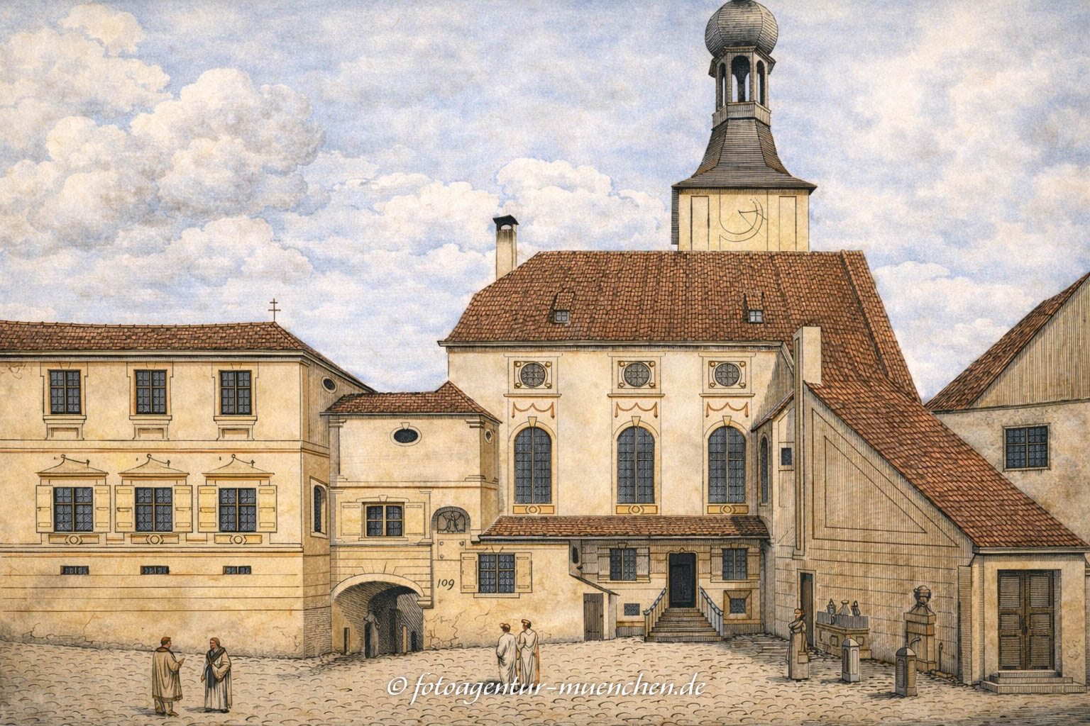 Blatt 24 zeigt die Rathhaus-Gebäude gegen den Peters-Freithof. Das Haus links im Bilde ist das aus dem XIII. Jahrhundert stammende, ganz aus Quadern erbaute Haus der Geschlechter-Familie Gollier, das die Stadt von dem damaligen Inhaber des Gollier-Benefiziums kaufte. Es ist wohl das älteste Haus Münchens und durch einen Bogen mit dem Gebäude verbunden, das den kleinen Rathhaussaal sammt Nebenzimmern umfaßt und ehedem aller Wahrscheinlichkeit nach auch das vom Ende des XIII. Jahrhunderts stammende Wohnhaus eines reichen Bürgers, vielleicht des Alnwich Gollier, war. Dafür spricht die Beschränktheit des Raumes. Ein Gebäude, das im Hochparterre nur einen Saal und eine gewölbte Küche, im oberen Stock aber nur ein paar kleine Zimmer enthält, konnte wohl den Ansprüchen eines Bürgers, nicht aber denen entsprechen, die man an ein Rathhaus stellen darf. Es wurde vom Rath seit 1315 nur provisorisch benützt, da ja das alte Dinghaus auf dem Marktplatz entfernt werden sollte, bei dem großen Saal nördlich vom Thurme aber keine Nebengemächer vorhanden waren. Das kleine Rathhaus heißt 1365 „der Bürger Hofstatt.“ Das Stiegenhaus rechts im Bilde wurde 1415 gebaut, als man auf die gegen das Thal zu gelegene Stadtwaage ein Stockwerk aufsetzte, um eine neue Rathstube einzurichten, da der kleine Rathhaussaal nicht mehr ausreichte. Auch ist die dahin führende Treppe für den öffentlichen Verkehr viel zu schmal.