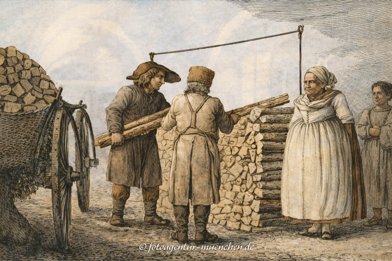 Die untere Hälfte des Kupferstiches stellt vor, „wie ein Klafter Holz durch einen hier verpflichteten Holzmesser gemessen wird. Die Versammlungsplätze der 16 Holzmesser sind die Hochbrücke, der eiserne Gitterbrunnen in der Sendlingergasse und der Platz vor der Michaelskirche. Der Lohn betrug für jedes Klafter 5 Kreuzer.“ (15 Pfennige.)