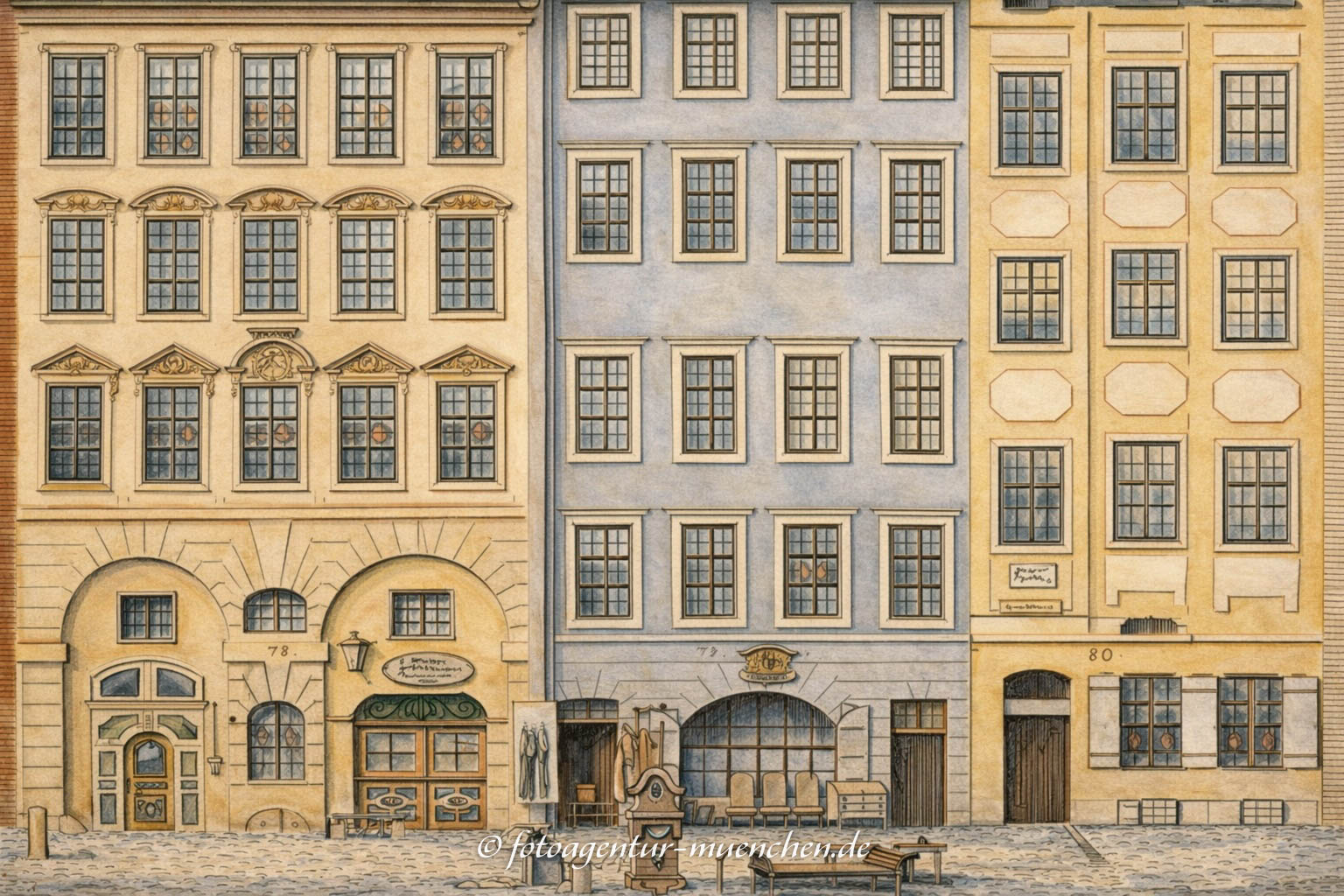 „Gegenwärtiger Kupferstich stellt die Häuser Nr. 78, 79 und 80 im Hackenviertel in der Kaufingergasse vor.“ Das Haus Nr. 78 — jetzt 12, das sogenannte Sabbadinihaus, ist Eigenthum der Kaufmanns-Wittwe Frau Elise Knorr, und gehörte 1519 dem Magister, Priester Sigmund Glonner, 1540—1585 der Familie Sonner, 1751 dem kurfürstl. Truchseß Karl Dietr. von Plötz, 1752 dem kurfürstl. geheimen Rath Grafen Max von Burgau, dann dessen Collegen Em. Ludw. Reichsgrafen von Leonrod, hierauf dem Straßeninspektor Joh. Ig. von Holzschuher, weiter dem Bürgermeister und Stadtkämmerer Benno von Reindl auf Mittelsbach, kam 1782 an den Handelsmann Angelo Sabbadini und 1804 an den Handelsmann H. P. Maffei. In der dritten Etage wohnte 1805 bis 15. März 1829, seinem Todestage, der bayerische Geschichtsforscher Lorenz Westenrieder. Im Laufe zweier Jahrhunderte war das Haus fünfmal Gasthaus.