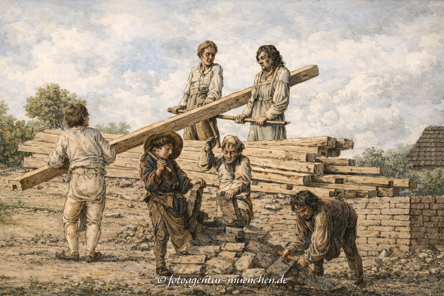 Auf der unteren Hälfte des Blattes sieht man Zimmerleute und Maurerjungen bei der Abbruchsarbeit.